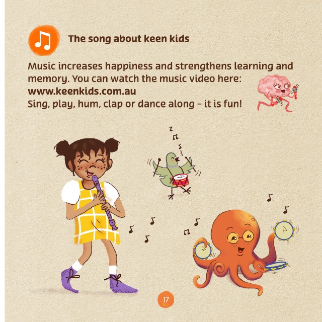 The song about keen kids Music increases happiness and strengthens learning and memory. You can watch the music video here: www.keenkids.com.au Sing, play, hum, clap or dance along - it is fun! 17 18